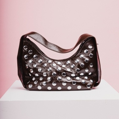 Mala de mão efeito pele com tachas. Tamanho médio. Forro e bolso interior. Alça fixa não ajustável.