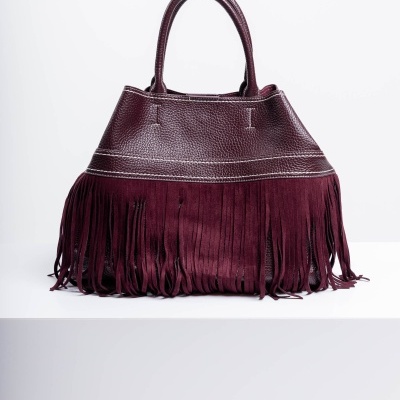 Mala de ombro de pele com franjas. Tamanho grande. Fecho de imã. Forro e bolsa interior com alça larga, ajustável.